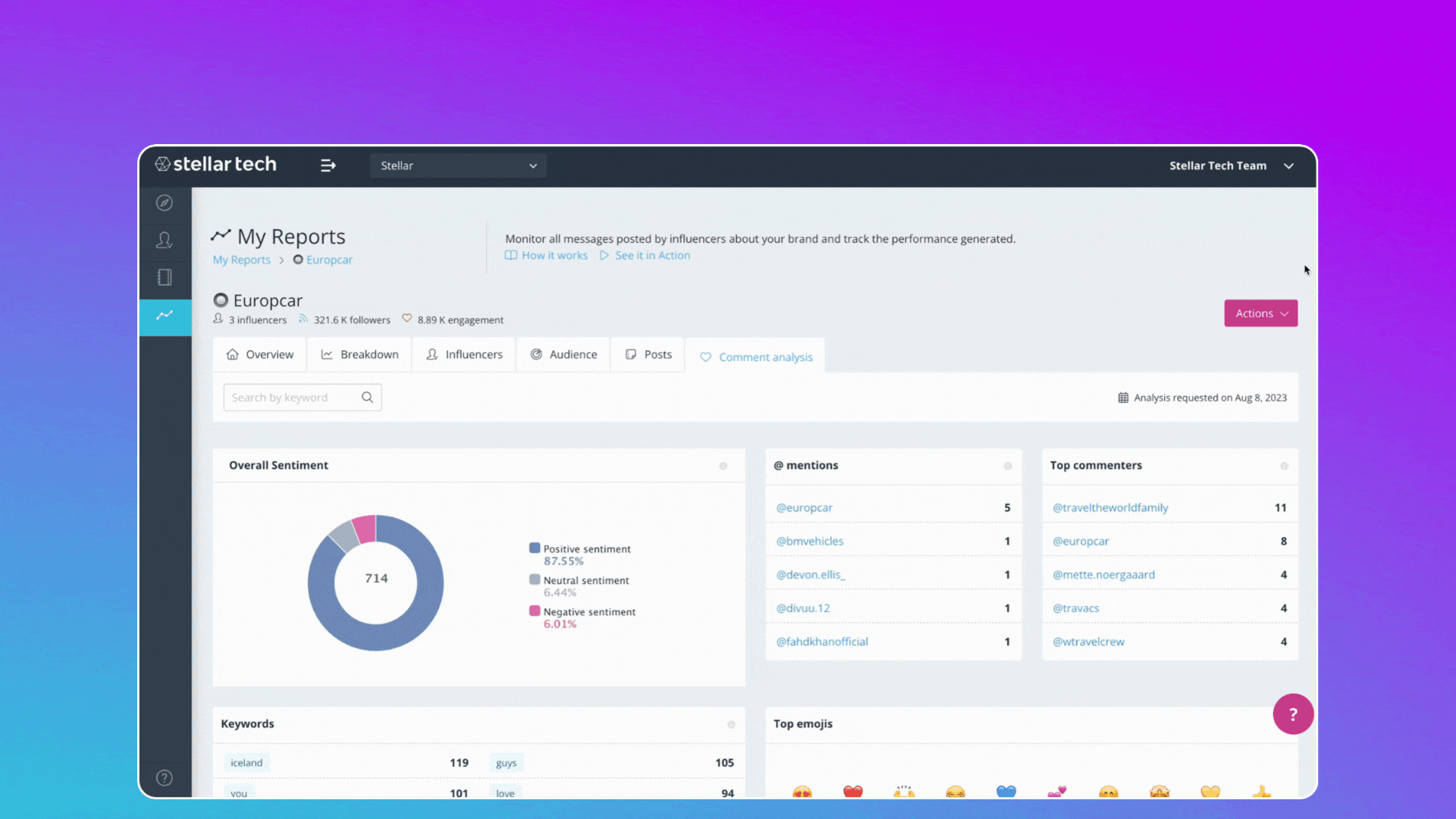 Le suivi de performance boucle la boucle. Reports consolide l’ensemble des contenus de la campagne, posts, Reels, stories, vidéos, et les enrichit avec des indicateurs d’engagement, de conversion et de ROI. À l’intérieur de Reports, l’analyse de sentiment scanne automatiquement les commentaires du public afin d’identifier les évolutions de ton et les tendances émergentes, offrant aux équipes une visibilité précoce sur la façon dont les spectateurs perçoivent réellement le contenu.