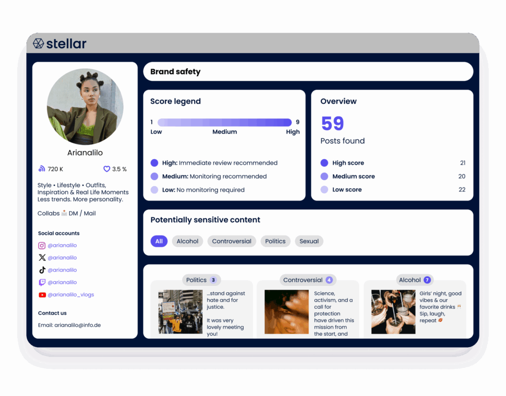 Pour les marques, cela signifie que la Brand Safety n’est pas une boîte noire. C’est un outil d’aide à la décision, et non un système d’exclusion automatisé. Stellar ne bloque ni n’exclut jamais automatiquement des créateurs sur la base des résultats de Brand Safety.